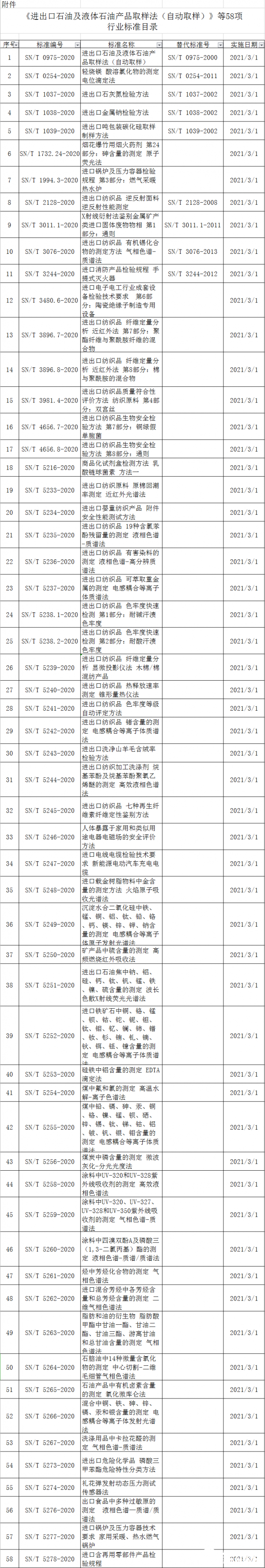 現(xiàn)發(fā)布《進出口石油及液體石油產(chǎn)品取樣法(自動取樣)》等58項行業(yè)標準(目錄見附件)。《進出口石油及液體石油產(chǎn)品取樣法(自動取樣)》(SN/T 0975—2000)等9項被代替標準自新標準實施之日起廢止。