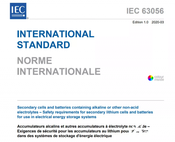 據IEC官網消息,IEC 63056:2020 《Secondary cells and batteries containing alkaline or other non-acid electrolytes - Safety requirements for secondary lithium cells and batteries for use in electrical energy storage systems》于2020年3月27日正式發(fā)布。IEC 63056:2020由IEC/SC21A歸口,其下設的WG5工作組負責制定。
