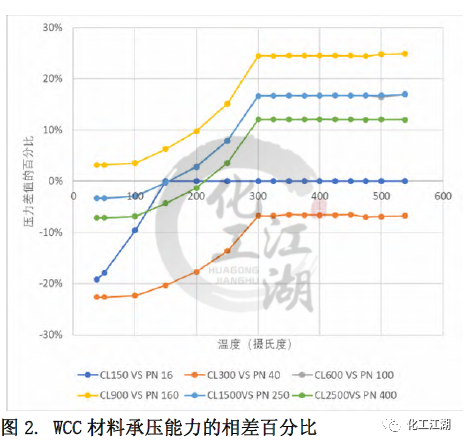 本文采用了對(duì)比冷(常溫)工作壓的方法來近似推算出與ASME標(biāo)準(zhǔn)Class壓力等級(jí)最鄰近的EN標(biāo)準(zhǔn)PN壓力等級(jí)。EN12516-1標(biāo)準(zhǔn)中列出的所有材料的冷工作壓都是相同的。而ASME B16.34標(biāo)準(zhǔn)中列出的冷工作壓和材料相關(guān),故選取了其中一種較強(qiáng)材料(C12A)的冷工作壓用于對(duì)比。 通過對(duì)比得到每個(gè)ASME標(biāo)準(zhǔn) Class壓力等級(jí)對(duì)應(yīng)的最鄰近的EN標(biāo)準(zhǔn) PN壓力等級(jí),見表1。同時(shí),這樣的對(duì)應(yīng)關(guān)系也和閥門設(shè)計(jì)的通用做法一致。本文的管道內(nèi)徑,最小壁厚,材料承壓能力的對(duì)比都是依照表1中的對(duì)應(yīng)關(guān)系來進(jìn)行的。 1.2 材質(zhì)承壓能力的對(duì)比 無論是ASME標(biāo)準(zhǔn)還是EN標(biāo)準(zhǔn)都列出了一些ASTM標(biāo)準(zhǔn)材料的壓力溫度等級(jí),即材料在不同溫度下的承壓能力。本文選取了常見的閥體材料:碳鋼WCC,合金鋼 WC9和C12A進(jìn)行研究,來對(duì)比兩個(gè)標(biāo)準(zhǔn)中相同材料在標(biāo)準(zhǔn)壓力等級(jí)下的承壓能力的差別。 圖1和圖 2顯示了WCC材料的溫度壓力曲線和Class與PN的對(duì)比,可以看出: (1)對(duì)于ASME的 Class 150和EN12516-1 的PN16,當(dāng)溫度低于150攝氏度時(shí),EN標(biāo)準(zhǔn)規(guī)定的材料承壓能力低于ASME標(biāo)準(zhǔn)規(guī)定的材料承壓能力,且隨著溫度升高,差距逐漸縮小。當(dāng)溫度高于150攝氏度時(shí),兩個(gè)標(biāo)準(zhǔn)對(duì)相同材料的承壓能力的規(guī)定近乎相同。 (2)對(duì)于ASME的 Class 300和EN12516-1 的PN40,在整個(gè)溫度的范圍內(nèi),EN標(biāo)準(zhǔn)規(guī)定的材料承壓能力均低于ASME標(biāo)準(zhǔn)規(guī)定的材料承壓能力。當(dāng)溫度低于300攝氏度時(shí),隨著溫度升高,差距逐漸縮小。當(dāng)溫度高于300攝氏度時(shí),兩個(gè)標(biāo)準(zhǔn)對(duì)相同材料的承壓能力的規(guī)定差別趨于一致,約為-7%。 (3)對(duì)于ASME的 Class 900和EN12516-1 的PN160, 在整個(gè)溫度的范圍內(nèi),EN標(biāo)準(zhǔn)規(guī)定的材料承壓能力均高于ASME標(biāo)準(zhǔn)規(guī)定的材料承壓能力。當(dāng)溫度低于300攝氏度時(shí),隨著溫度升高,差距越來越大。當(dāng)溫度高于300攝氏度時(shí),兩個(gè)標(biāo)準(zhǔn)對(duì)相同材料的承壓能力的規(guī)定差別趨于一致,約為24%。 (4)還有一點(diǎn)值得注意的,除了PN16,其他PN壓力等級(jí)對(duì)應(yīng)的工作壓力在低于300攝氏度以下都是一樣的,而ASME等級(jí)對(duì)應(yīng)的工作壓力是隨著溫度升高持續(xù)下降的。 1.3 對(duì)閥體設(shè)計(jì)的指導(dǎo) 在實(shí)際設(shè)計(jì)過程中,無論是為了縮短新產(chǎn)品推向市場(chǎng)的時(shí)間,還是從產(chǎn)品標(biāo)準(zhǔn)化、成本優(yōu)化的角度去考慮,盡可能多地將已有的設(shè)計(jì)或者零部件(尤其是需要開發(fā)鑄造模具的閥體)應(yīng)用到新的產(chǎn)品中,都是設(shè)計(jì)師不可避免要考慮的問題,可以采用同一個(gè)閥體鑄件的設(shè)計(jì)來滿足ASME 標(biāo)準(zhǔn)和EN標(biāo)準(zhǔn)的要求呢?為了解答這個(gè)問題,本文選取了三個(gè)不同壓力等級(jí)-低、中、高的十二個(gè)具體實(shí)例,各項(xiàng)參數(shù)的對(duì)比結(jié)果如表3 所示。 (1)低壓ASME Class 300與 EN PN40 從表3中差別的百分?jǐn)?shù)可以看出,在兩個(gè)尺寸下,滿足ASME標(biāo)準(zhǔn)和EN 標(biāo)準(zhǔn)的管道內(nèi)徑和最小壁厚的差別,均小于5%。就是說,用同一個(gè)閥體設(shè)計(jì)來滿足兩個(gè)標(biāo)準(zhǔn)的設(shè)計(jì)要求是可以接受的。同時(shí)從圖2中可以看出,閥體常見材料在這兩個(gè)等級(jí)的承壓能力差別也較小,10%以內(nèi)。因此,兩個(gè)設(shè)計(jì)可以在類似的實(shí)際工況中應(yīng)用。 (2)中壓ASME Class 900與 EN PN160 對(duì)于中壓下尺寸為DN100和DN200的兩組設(shè)計(jì),從差別的百分?jǐn)?shù)可以看出,雖然每組中要對(duì)比的兩個(gè)設(shè)計(jì)的管道內(nèi)徑非常接近,但是所要求的最小壁厚卻相差較多,超過了20%。在這種情況下,實(shí)踐中也是可以用同一個(gè)閥體設(shè)計(jì)來滿足兩個(gè)標(biāo)準(zhǔn)的設(shè)計(jì)要求的,但是需要評(píng)估由此帶來的對(duì)最小壁厚要求較小的閥體的成本的影響。另一方面,從圖2中可以看出,閥體常見材料在這兩個(gè)等級(jí)的承壓能力差別較大,在有些溫度下差別達(dá)到20%。這種材料承壓能力上的差別和最小壁厚的差別是一致的。 (3)高壓ASME Class 2500與EN PN400 對(duì)于高壓下尺寸為DN100和DN200,閥門的管道內(nèi)徑和最小壁厚存在著巨大差別,30%-50%,故采用同一個(gè)閥體設(shè)計(jì)來滿足兩個(gè)標(biāo)準(zhǔn)的設(shè)計(jì)要求是不合理的。 還有另外一個(gè)因素需要在閥體設(shè)計(jì)時(shí)考慮,那就是閥體兩個(gè)端口之間的長(zhǎng)度。ASME B16.34中指出可以按照ASME B16.10來確定端口對(duì)端口尺寸。EN12516-1 并未提及端口對(duì)端口尺寸,但歐標(biāo)體系中EN558規(guī)定了端口對(duì)端口的尺寸??紤]到端口對(duì)端口尺寸并非標(biāo)準(zhǔn)強(qiáng)制要求,故本文未提供ASME B16.10和EN558的區(qū)別。 (1)管道內(nèi)徑 ASME標(biāo)準(zhǔn)和EN標(biāo)準(zhǔn)在管道內(nèi)徑的主要差別在
