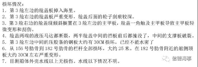 事故導(dǎo)致了百萬美金的巨大損失;幸運(yùn)的是,事故發(fā)生時(shí)沒有任何人員站立在該艙左側(cè)甲板上;可以想象的是:如果當(dāng)時(shí)有人站立在左側(cè),則很難幸免!
