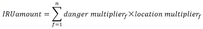 定義綜合指標(biāo)火災(zāi)風(fēng)險(xiǎn)單元(ignition risk unit,IRU)。每次火災(zāi)的具體考核中,加入“地理分布因子Location multiplier”和“火災(zāi)危險(xiǎn)等級因子danger multiplier”,計(jì)算公式為: