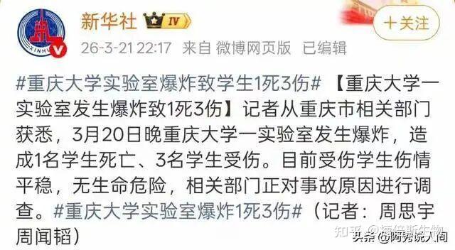 3月20日晚7點(diǎn),重慶大學(xué)科學(xué)城校區(qū)的一個實(shí)驗(yàn)室突然爆炸。當(dāng)時有四名學(xué)生在里面做實(shí)驗(yàn),爆炸發(fā)生后一名學(xué)生當(dāng)場死亡三人受傷,現(xiàn)場儀器碎了一地,地上還有血跡。