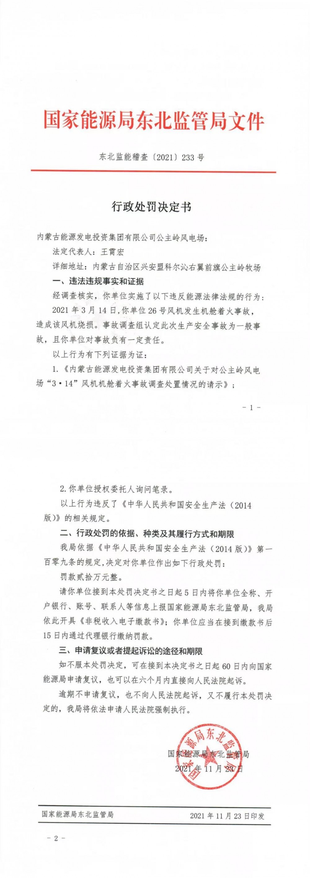 國家能源局東北監(jiān)管局通報內(nèi)蒙古公主嶺風場“3.14”風機著火事故的處罰