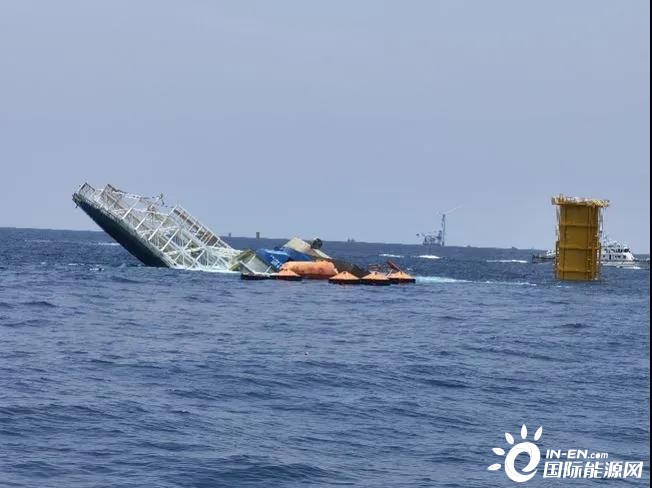 7月26日,中廣核惠州風電項目“升平001”號作業(yè)船施工平臺發(fā)生傾斜事故后,搜救行動進入第二天,仍有4人失聯!據了解,"升平001"施工平臺露出水面部分在緩慢減小,有趨向沉沒的跡象,平臺上面的鐵架已倒入水下。