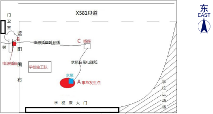 約9時(shí),馮建威先到達(dá)現(xiàn)場查看情況,協(xié)調(diào)借用抽水泵和處理其他維修點(diǎn)工作。隨后,薛柏林、趙文輝駕駛工程車到達(dá)耕管村附近,將一些工具和材料送給附屬施工隊(duì)【1】后,約9時(shí)20分到達(dá)該爆水管處。兩人經(jīng)商量決定先抽走水坑里的水再檢查和維修水管。薛柏林駕駛工程車向附近(約500米外)作業(yè)的附屬施工隊(duì)借回一臺(tái)潛水泵(規(guī)格為3寸220V)和一根普通電源插座延長線,回來后將潛水泵放進(jìn)水坑中。趙文輝和薛柏林向?qū)W校維修項(xiàng)目工地(靠學(xué)校操場跑道側(cè))借用臨時(shí)用電,將連接潛水泵的電源插座延長線插在工地施工用的排插上,啟動(dòng)后發(fā)現(xiàn)潛水泵不運(yùn)行,兩人徒手搖晃潛水泵并調(diào)整插頭,發(fā)現(xiàn)潛水泵仍不運(yùn)行。經(jīng)詢問現(xiàn)場施工人員及剛好經(jīng)過的學(xué)校保安林建軍,得知樹下還有一處借電點(diǎn),保安林建軍未經(jīng)請示校領(lǐng)導(dǎo)同意擅自協(xié)助兩人將電源插座延長線直接插到樹上排插上,此時(shí)潛水泵還是不運(yùn)作,趙文輝和薛柏林懷疑潛水泵可能有故障或者是有雜物堵塞。約9時(shí)45分,趙文輝走向C處查看插頭是否松動(dòng)時(shí),薛柏林則用雙手徒手檢查潛水泵故障,不慎發(fā)生觸電。此時(shí),馮建威已回來在一旁與上橫中心小學(xué)的張志老師交談,突然聽到薛柏林發(fā)出“觸電”的叫聲,隨即跌倒在地,雙腳落入水坑中。趙文輝立馬拔掉潛水泵自帶電源線的插頭,薛柏林掙扎爬到水坑邊臉朝下趴在地上,臉色發(fā)白,處于昏迷狀態(tài)。