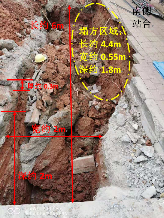 溝槽開挖處上層為原龍海二路混凝土硬化路面,厚約0.3m,南側(cè)臨龍海二路惠豐城公交站站臺(tái)鋪磚區(qū),現(xiàn)場(chǎng)采用挖機(jī)垂直開挖;開挖溝槽寬度約2m,長(zhǎng)度約為6m,深度約為2m(局部2.3m)。