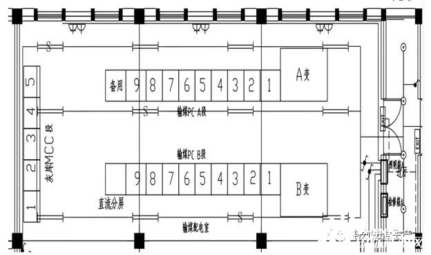 在輸煤配電室內(nèi),同時設(shè)計布置灰?guī)霢、B兩段MCC。兩段MCC各帶一個浪涌保護(hù)器,分別設(shè)置在兩段MCC進(jìn)線開關(guān)側(cè)。400V灰?guī)霱CC開關(guān)柜為MNS型開關(guān)柜?;?guī)斓裙孟到y(tǒng)的建設(shè)為A標(biāo)段的工作內(nèi)容,天津公司負(fù)責(zé)灰?guī)霱CC安裝,天津公司分包給中某建設(shè)實(shí)施。輸煤系統(tǒng)和灰?guī)祀娫唇泳€圖見圖一;配電室俯視示意圖見圖二。