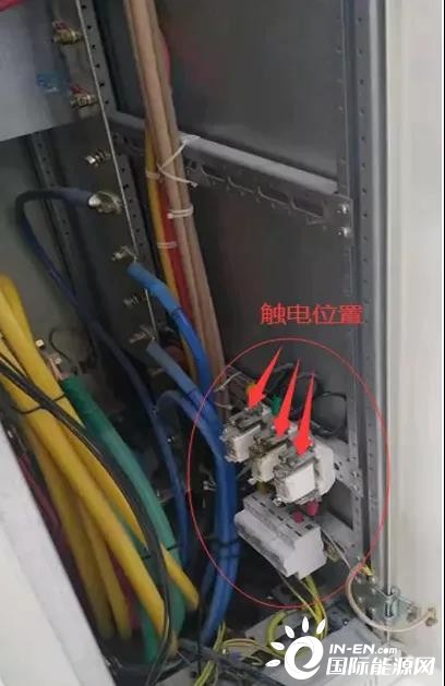 8月28日8點(diǎn)22分,王某帥(戴絕緣手套)完成本人負(fù)責(zé)的間隔電纜穿線并固定后,聽到隔壁柜發(fā)出聲響,檢查發(fā)現(xiàn)耿某坡(穿短袖上衣、未佩戴絕緣手套)身體倒進(jìn)灰?guī)霢段MCC柜01間隔,右臂肘部及上臂與該柜浪涌保護(hù)熔斷式保險上插頭(裸露)三相搭接(現(xiàn)場照片見圖三)。王某帥立即通過拖拽耿某坡鞋子將其拉出間隔,并告知現(xiàn)場保安撥打120急救電話,同時進(jìn)行不間斷心肺復(fù)蘇,通知本隊伍經(jīng)理霍某平。