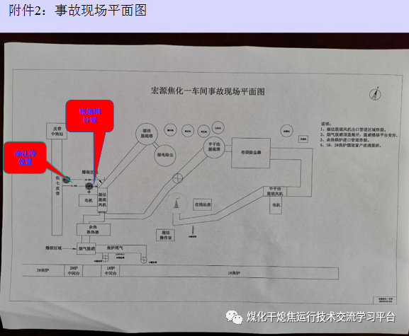 宏源煤焦化工有限公司一車間由于焦?fàn)t煙道氣半干法脫硫系統(tǒng)除塵布袋堵塞無法正常運行,于9月1日白班停止半干法脫硫系統(tǒng),啟動濕法脫硫系統(tǒng)運行,處理后的煙道氣由于含水量大,溫度較低不能進入焦?fàn)t煙道大煙囪,改由濕法脫硫系統(tǒng)煙囪排放。9月8日8時54分左右引風(fēng)機停車,由于焦?fàn)t煙道氣脫硫脫硝控制室人員董副紅在現(xiàn)場巡檢,造成控制室無人值守,未能及時發(fā)現(xiàn),從而未及時采取應(yīng)急處置措施,也未通知焦?fàn)t主控室人員采取應(yīng)急處置措施,而焦?fàn)t9時仍正常進行交換,交換完成時間大約為47秒,交換作業(yè)完畢后焦?fàn)t主控室人員發(fā)現(xiàn)煙道吸力降至20Pa左右,隨即采取了停止加熱措施;9時04分左右在工段長張耀剛指揮下董副紅重新啟動引風(fēng)機,9時06分左右發(fā)生爆炸, 9時22分左右焦?fàn)t煙道氣脫硝系統(tǒng)發(fā)生爆炸。