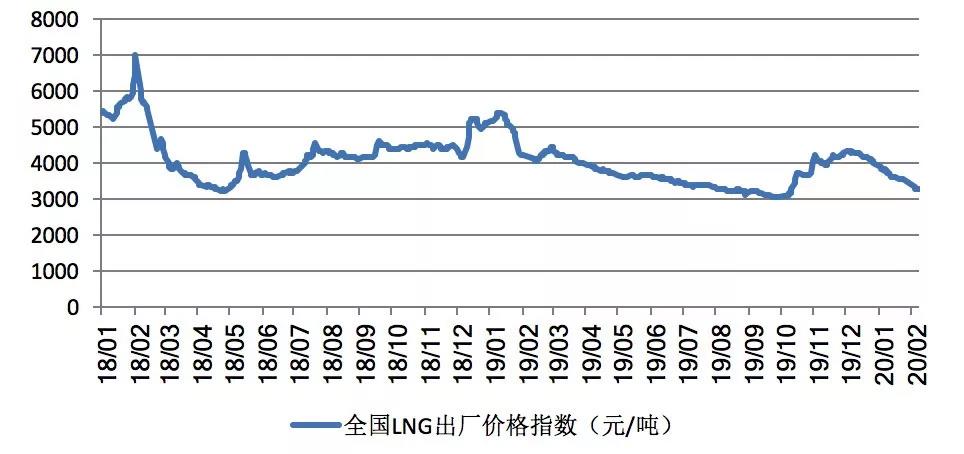 國(guó)內(nèi)LNG需求的低迷導(dǎo)致其價(jià)格也承壓下行。根據(jù)上海石油天然氣交易中心發(fā)布的全國(guó)LNG出廠價(jià)格指數(shù)測(cè)算,2月7日,全國(guó)LNG出廠價(jià)為3277元/噸,與去年同期高于4000元/噸的價(jià)格水平下跌18%,較2019年12月31日的3929元/噸的價(jià)格水平下跌652元/噸,跌幅為16.6%。