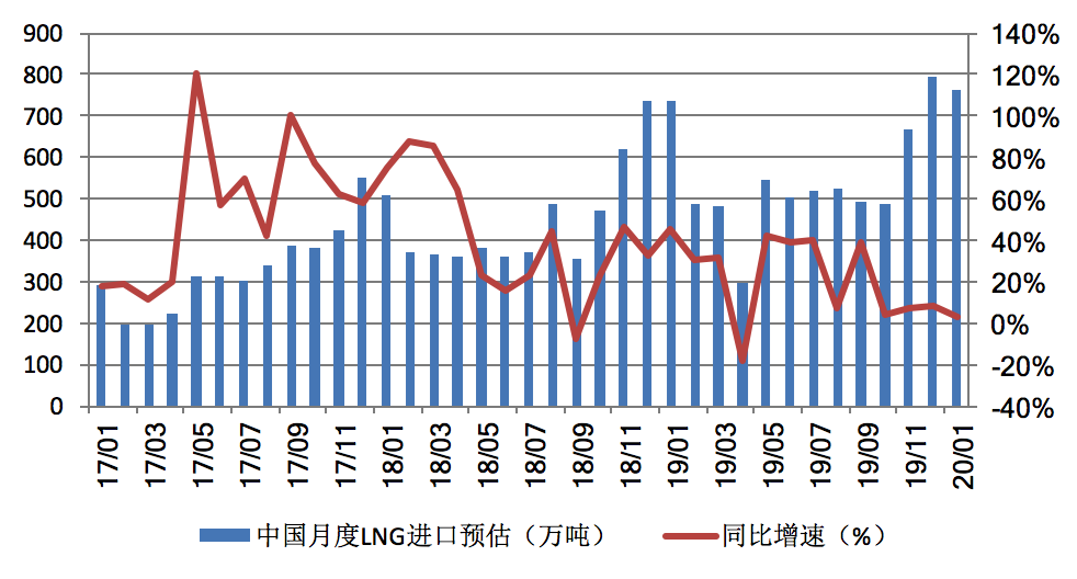 新華能源E-gas數(shù)據(jù)平臺(tái)的預(yù)測(cè)結(jié)果顯示,2020年1月份,中國(guó)LNG進(jìn)口量預(yù)計(jì)為763萬(wàn)噸,較去年同期增長(zhǎng)3.4%,較2019年12月減少3.9%。