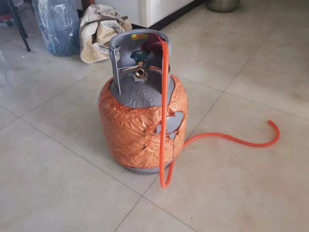 住戶:當時我沒有點火,我老公在那點火呢,聽見嘭一聲,聲音特別悶。我說這是干什么呢,把我嚇死了。 我一看 是液化氣罐這里噴火呢,就是這個情況。