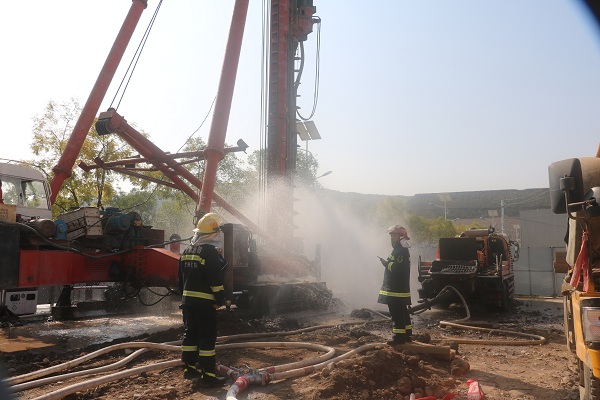蘭州支隊(duì)七里河消防大隊(duì)第一時(shí)間到達(dá)現(xiàn)場參與處置,到達(dá)現(xiàn)場后發(fā)現(xiàn):現(xiàn)場管道仍處于天然氣泄漏狀態(tài),未有明火發(fā)生?,F(xiàn)場指戰(zhàn)員立即設(shè)置警戒線,對現(xiàn)場圍觀施工人員及群眾進(jìn)行疏散撤離,對泄露事故點(diǎn)毗鄰居民樓進(jìn)行人員通告疏散,同時(shí)設(shè)置水槍防護(hù)陣地。隨著增援中隊(duì)處置力量的到達(dá),現(xiàn)場處置指揮員七里河大隊(duì)大隊(duì)長,統(tǒng)一指揮調(diào)度現(xiàn)場事故處置力量:首先,結(jié)合現(xiàn)場街道路況,設(shè)置疏散組,對毗鄰居民樓全面進(jìn)行人員清查疏散。設(shè)置警戒組并專人看守,嚴(yán)防非事故處置人員進(jìn)入。然后在先期到達(dá)成立的消防水槍防護(hù)陣地基礎(chǔ)上,增設(shè)水槍防護(hù)陣地;其次調(diào)派到達(dá)現(xiàn)場的增援消防中隊(duì)兩臺水罐消防車全程待命,做好供水保障。