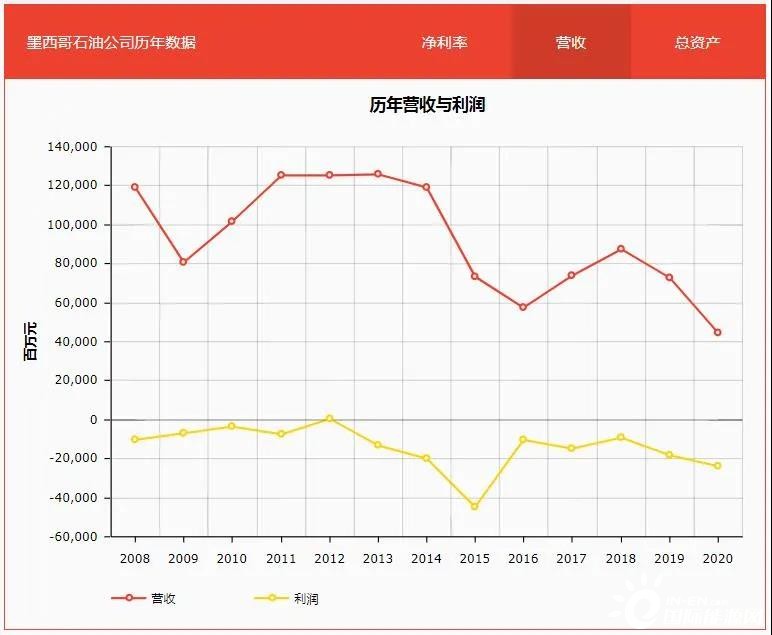 再看2008年至今的財報數(shù)據(jù),這一區(qū)間內(nèi)墨國油幾乎全部呈現(xiàn)虧損狀態(tài),2020年遭遇疫情嚴(yán)重沖擊,虧損額度更是高達(dá)230億美元。
