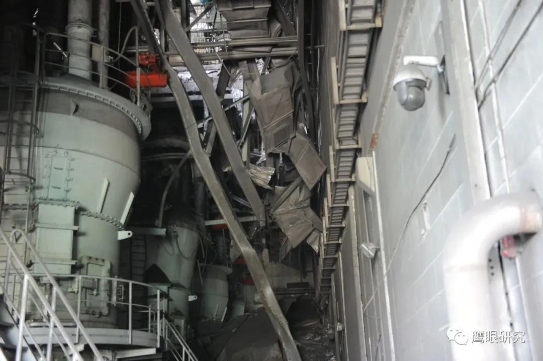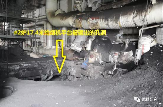 現(xiàn)場檢查,#2爐2D原煤倉下部錐體部脫落,砸壞2D給煤機平臺,連同給煤機墜落至#2鍋爐零米,2D給煤機損壞、2C、2D磨煤機油站、2D磨煤機、給煤機附近區(qū)域電纜、輔汽聯(lián)箱管道等設備不同程度受損,無人員傷害及主設備損壞。(堵煤次數(shù)太多,敲塌了?)