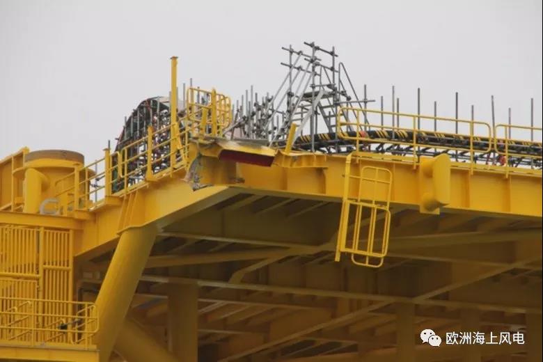 照片顯示導(dǎo)管架外表有凹痕,平臺電纜橋面的一個角落損壞。