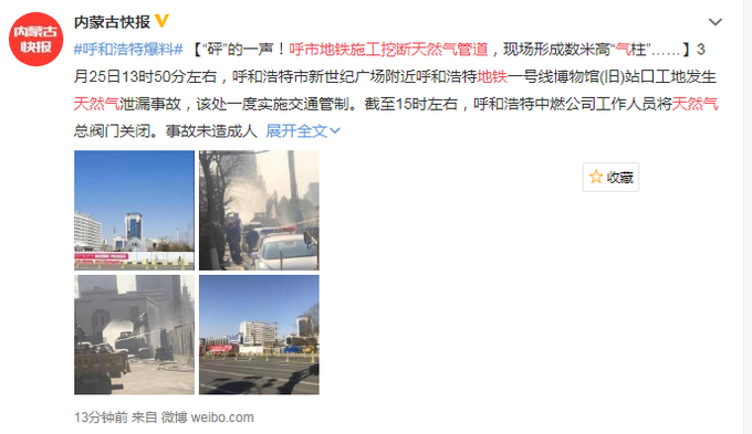3月25日13時50分左右,呼和浩特市新世紀(jì)廣場附近呼和浩特地鐵一號線博物館(舊)站口工地發(fā)生天然氣泄漏事故,該處一度實施交通管制。