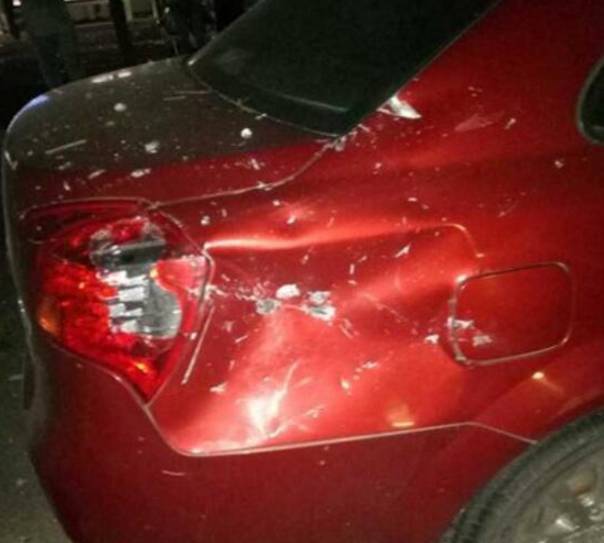 記者從現(xiàn)場視頻中可見,一家名為 " 誠信藥店 " 的店面玻璃門破損變形,里面的柜臺和房頂被炸得七零八落,地面一片狼藉。路上和門外兩輛轎車上散落著碎玻璃,車身因為撞擊發(fā)生凹凸變形,可見當時的沖擊力很大。