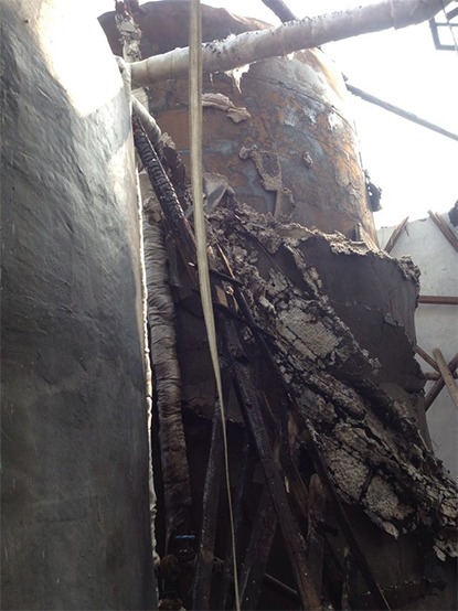 現(xiàn)場(chǎng)勘察發(fā)現(xiàn),3號(hào)罐輸送至1號(hào)罐的輸送管水平距離為10米,并用保溫材料進(jìn)行保溫。爆炸現(xiàn)場(chǎng)1號(hào)罐固定頂被炸飛,另兩只儲(chǔ)罐完好。爆炸的1號(hào)罐罐頂材質(zhì)為厚度5mm的鐵板,自制而成。內(nèi)壁較為粗糙,進(jìn)料口附近約50cm的范圍內(nèi)有熏黑的痕跡,未煙熏部分有鐵銹。罐頂設(shè)有人孔蓋和放空口,在人孔蓋附近無保溫材料,外壁有明顯燃燒的痕跡,人孔蓋與罐頂原有焊接縫處的焊接片脫落,說明罐頂外壁燃燒有一段時(shí)間。被結(jié)晶萘堵塞點(diǎn)位于1號(hào)罐罐頂進(jìn)料口水平距離約40cm,垂直距離約40cm,堵塞點(diǎn)與進(jìn)料口連接的法蘭已拆除;現(xiàn)場(chǎng)留有氣割槍等工具。