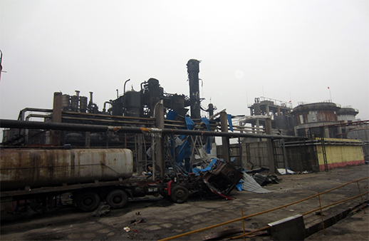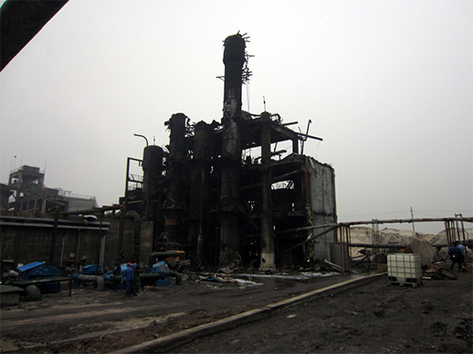 | 8月25日 | 18:46:22 | 氧化塔爆炸,并相繼引燃了氧化塔周邊氫化塔、萃取塔等設(shè)備中的物料。爆炸導(dǎo)致在四層平臺取樣的張某、一層北側(cè)檢查的秦某和程某當場死亡;并導(dǎo)致雙氧水車間南300米的氯堿車間氯氣管道受損,造成少量氯氣泄漏;爆炸碎片和泄露的氯氣導(dǎo)致雙氧水車間辦公室朱康康,中控室鄭某、金某、秦某,氯堿車間荊某、秦某和水泵房張某等7人受傷。 |