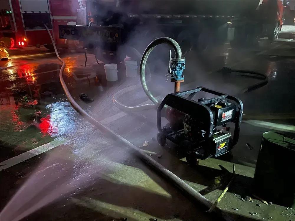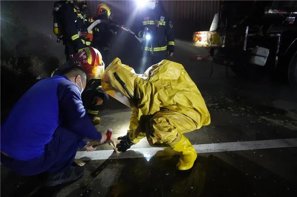 與此同時(shí),戰(zhàn)斗員穿戴好防化服,在水槍的掩護(hù)下帶著無(wú)火花快速堵漏器材靠近閥門實(shí)施堵漏作業(yè)。經(jīng)過(guò)47分鐘的努力,22時(shí)30分,堵漏成功,隨后前方指揮部安排儲(chǔ)罐車對(duì)泄露鹽酸車輛進(jìn)行倒罐處置。